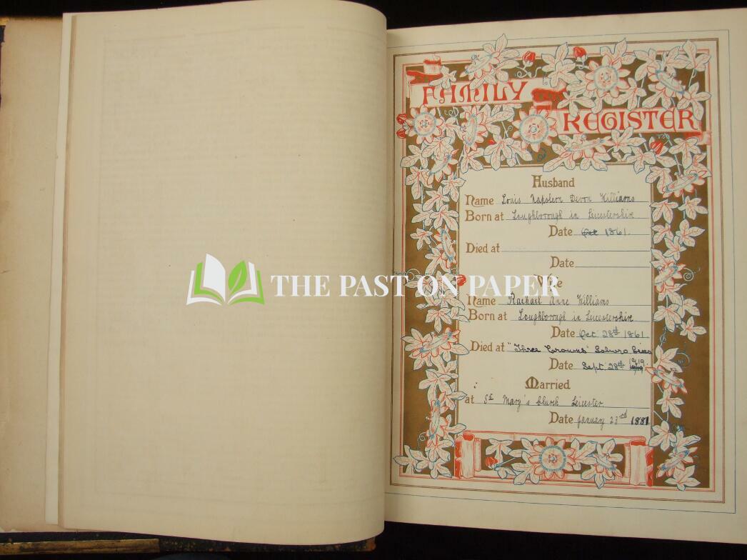 The family register lists the birth and marriage dates of her parents Louis Napoelon Devon Williams (b. 1861) and Rachel Anne Williams (b. 1861) (who we know to be Rachael Anne Brooks of Loughborough). They married in January 1881. The Bible also lists the birth and death of Adelaide Maud, along with her marriage to R W Hart in 1917. There is a further "Special Events" section.