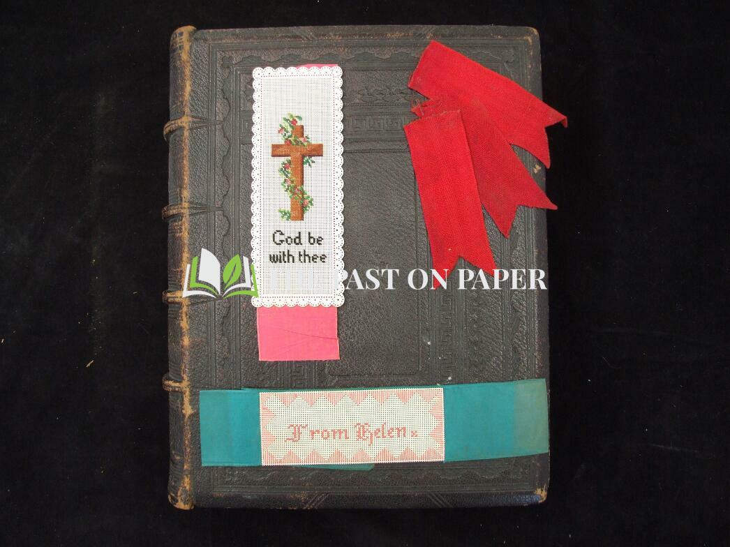 The register is written on one page in two, or possibly three neat hands. The Bible includes a number of inserts found within the pages: An embroidered card on faded red silk depicting a cross with the words "God be with thee"; An embroidered card on green silk with the words "From Helen x"; Three pieces of red tweed, each around four inches in length.