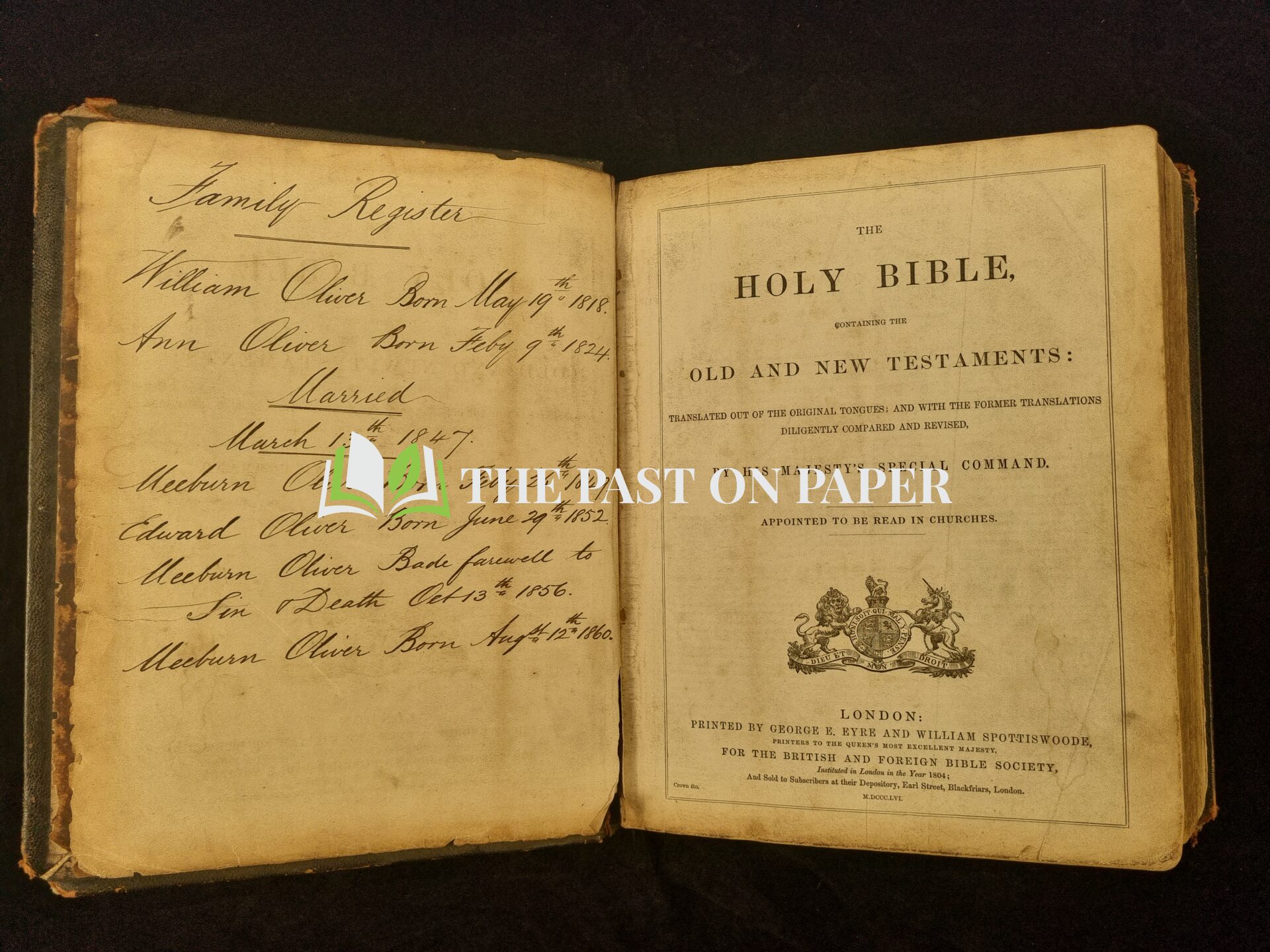This bible occupies a fascinating position at the intersection of religious, printing and family-history interest. The British and Foreign Bible Society was founded in 1804 to widen circulation of the Scriptures, and the London-based firm Eyre & Spottiswoode (with William Spottiswoode later becoming President of the Royal Society) is notable in the history of British printing.