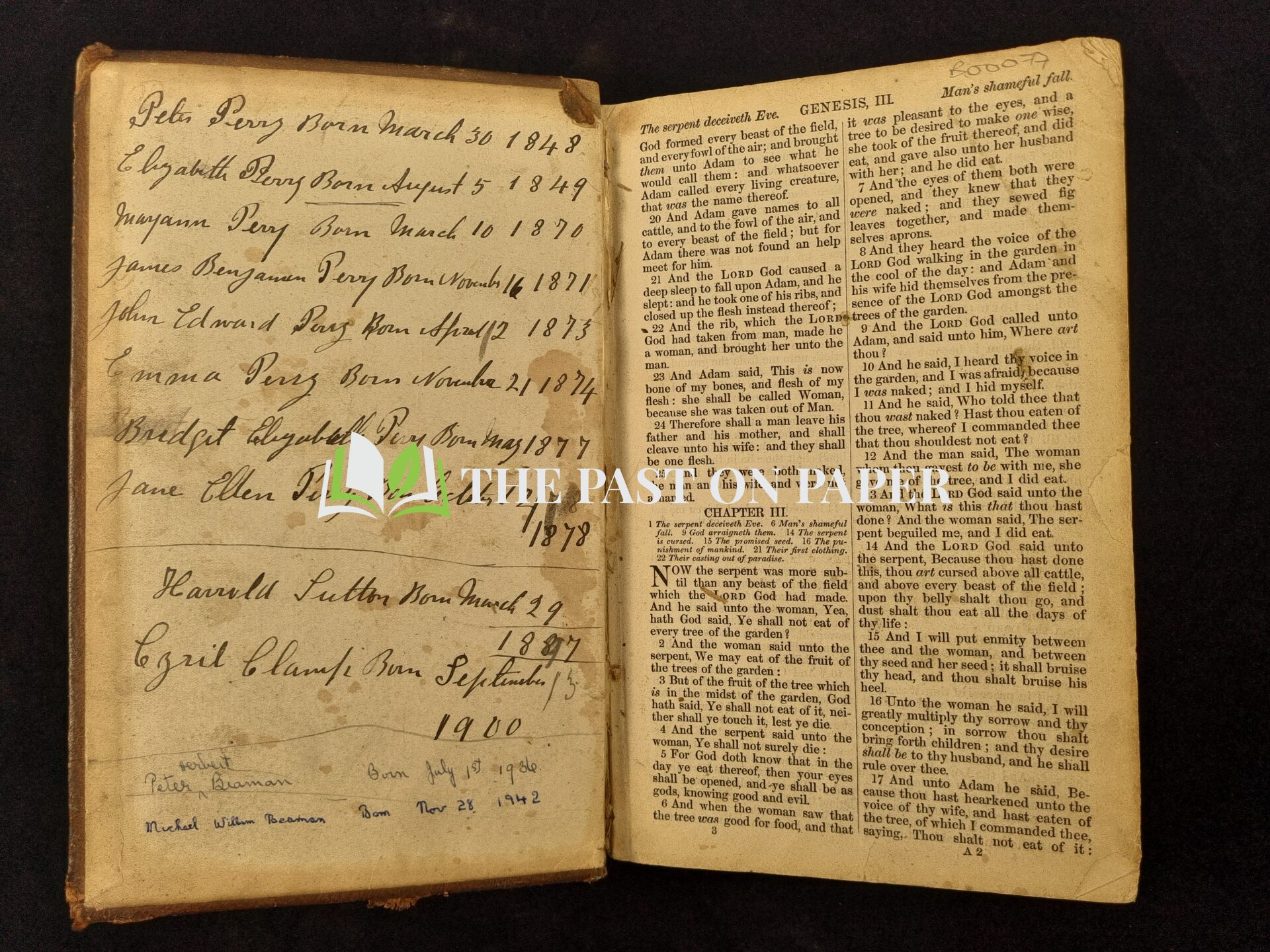 A remarkable capsule of family history — this mid-19th century Bible, published by the British and Foreign Bible Society, offers a rich genealogical register for the Perry, Beaman, Clamp and Sutton families, spanning more than 100 years.
