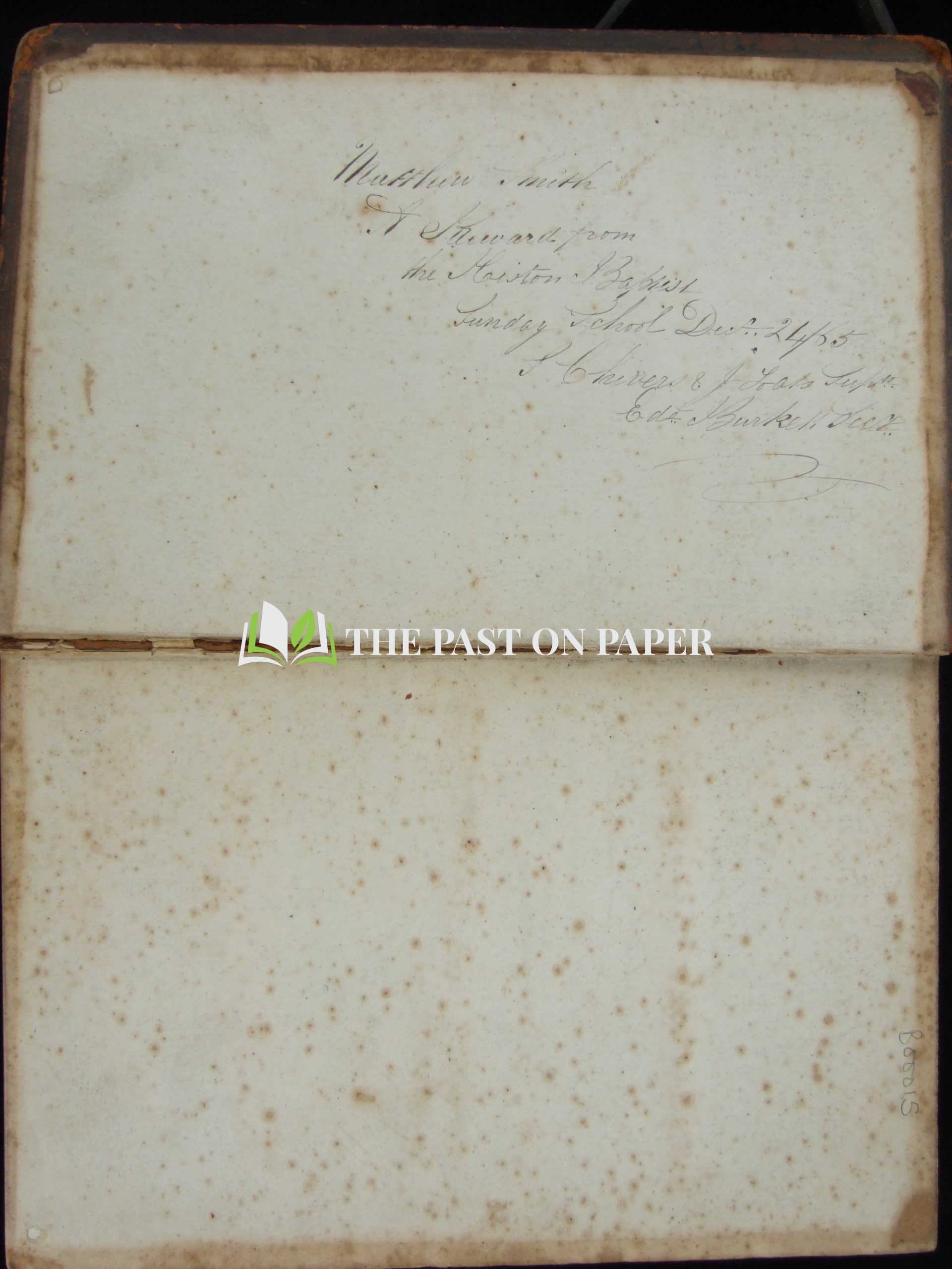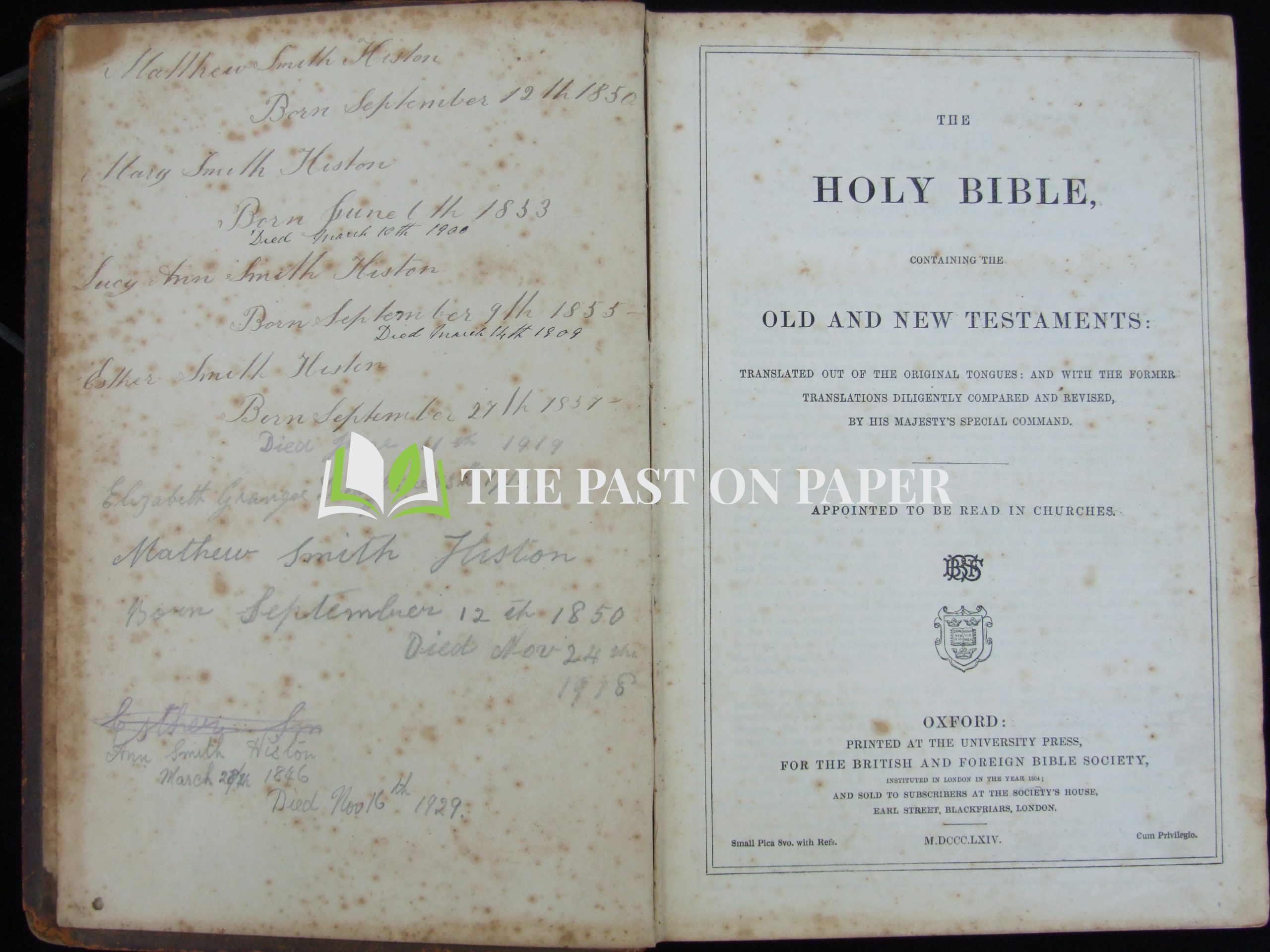 Midsized leatherbound Bible, presented to Matthew Smith by the Histon Baptist Sunday School on Christmas Eve 1865, and containing birth and death details of his siblings Ann (b. 28th march 1846), Mary (b. 11th June 1853), Lucy Ann (b. 9th September 1853), and Esther (b. 27th September 1857), as well as his own birth and death dates and the death date of Elizabeth Granger.