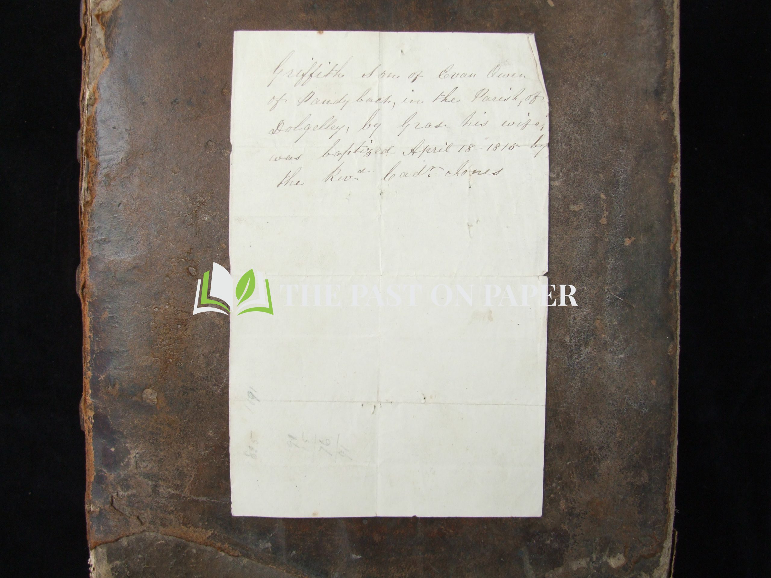 Originally belonging to Evan Pugh (b. 1768) and his partner (wife?) given as Margaret Richard (b. 1774), and beautifully inscribed as such with a flourish on the rear endpaper. The Bible then passed down to his daughter Ann, who married Griffith Owen, son of Evan Owen (or Owens) of Pandy-Bach, Dolgelly. In all, ten individuals across three generations with birthdates are listed in the Bible. Included is a small half foolscap sheet of paper listing the baptism of Griffith in 1816, as well as naming his parents.